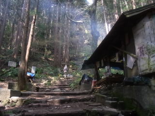 三合目の先に自己責任と書かれた別ルートがありここにつながる。でも鳥居を見ると別ルートの方が本来の登山道のようだ。夏は日陰で涼しいらしい。ここからも別のルートが七合目の上までつながっている。上級者コースらしい。 |