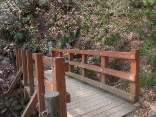 右山、左谷で沢の切れ込みに架かる木橋。まだ新しい。七合目の先にも同じような橋があったが九十九折なのでここと逆で右谷、左山の所。 |