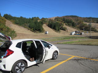 初心者は足がすくむが、スノボでここを豪快に下りると気持が良い。天気が良いので眺望が更に良い。左に駒、右に八海、中間奥に中が見える。ゲレンデ表面は赤土で草が生えていなかった所は侵食されている。 |