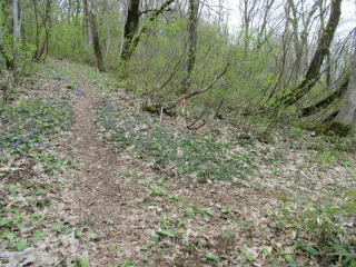尾根道だが潅木があるので眺望は殆ど無い。タチツボスミレとオオバキスミレが多い。地味なエンレイソウも咲いていた。 |