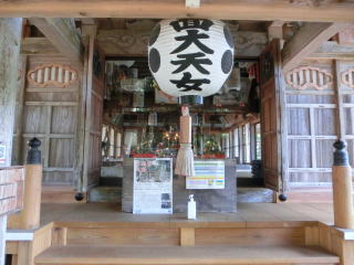 看板の左に広い未舗装の駐車場があるが、先に見える小屋裏の日影にスクーターを停める。連日暑い日で車も人もいない。車道もあるが参道と階段を上って行く。 |