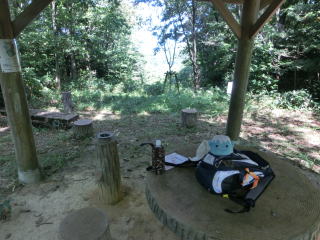 日向に出て暑い。左に上るとすぐ林道の分岐。更に左に林の中に入る。マップにある妙見山休憩所(二ノ丸)は林道を右の方なのか。分からなかった。 |