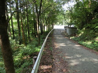 林道の一方通行の出口で車両進入禁止と歩行者は遊歩道を通るようにと表示がある。だが自分は歩く。初めての道。カーブが連続、傾斜もある。 |