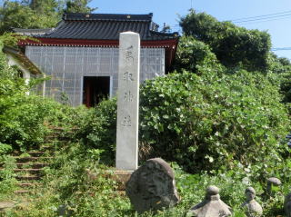 椎谷観音堂への階段を上って近くの山に行く程度の軽い気持だったが、道は薮で標識は無く、まだ林の中は歩けたが、日向に出ようとすると夏草が胸までびっしり繁茂して断念、リタイア。 |