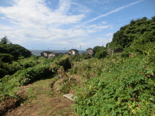 観音堂への階段を探して畑の道も上ってみるが、無いので戻った所。海が見える。天気だけは良かった。下って香取神社の石柱から上って、観音堂への階段を見つける。 |