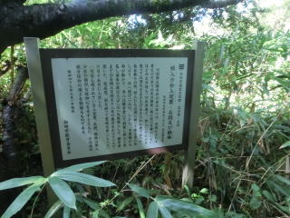 隠された山門から石段を上ると由緒の書いた案内板。命が助かった乱暴者が心を入れ替えて一人で観音堂までの三百段の石段を築いた、というような事が書いてある。 |