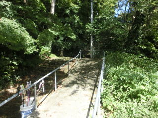 一旦車道に出て、向かいに観音堂への石段が続く。ストックがあるが、それ程急では無い。ただ濡れた苔の部分は滑るので要注意。 |