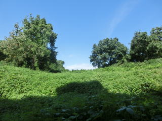 林から出ると大薮。これが胸まであって、互いに絡まりあって、トゲの草もあって前進を断念。感覚的には右に頂上がある気がする。ここで戻る。大駐車場に戻って、車道から旧国道に出る。 |