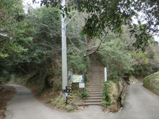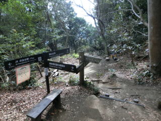 道が3方向。左の車力道へ行く。真ん中の階段が関東ふれあいの道。右は行止りらしい。左に行くと富津館山自動車道が遥か高いその下を通過し、車力道の登山口から山道になる。 |