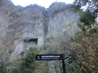 左が頂上方面。真直ぐ下って右がロープウエー、日本寺と関東ふれあいの道方面。いよいよ圧巻の岩の絶壁と石を切り出した跡を見ながら上る。石の階段は石を敷いたのではなく、岩を削って階段にしたもの。手摺あり。 |