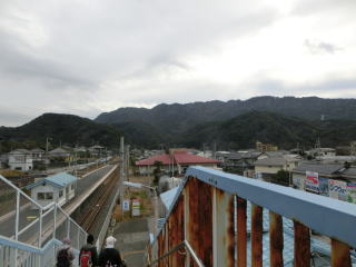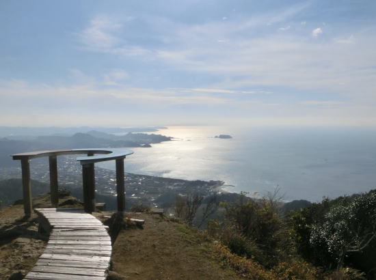 | 管理人のページ h051k0171? | 2026年1月7日12時30分東京湾を望む展望台 千葉の朝は雨で、北の浜金谷駅から登る途中は曇りで鋸山頂上では風強く寒かった。昼食後に寄った展望台は予報通りに晴れて来た。下は鋸山南の保田(ほだ)の町。鋸山への林道がある。 |