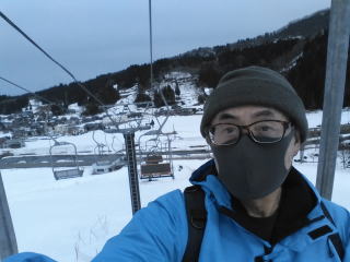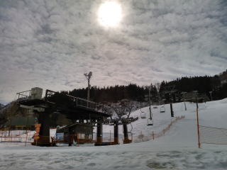 左はすぐ刈谷田川、右の建物はリフト券売り場兼休憩所。トイレもあり、ここで持参の昼食を食べた。今日が平日営業の最終日。それにしてもこの写真は夕方みたい。昨日だったら晴れていた。