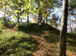 ここが黒滝城の頂上で標高246mで天神を祭る石塔がある。木の間から298mの剣ヶ峰が見える。ここからは木が邪魔で弥彦山が見えない。森林公園で縦横に道があるが荒れている場所もある。 |