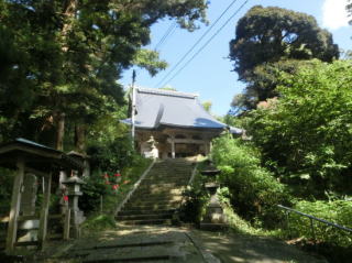 この石段を上ると正面に本堂、右に大ケヤキと蔵があった。本堂の奥に下の大駐車場からの車道が続いていた。途中から天拝山へと思われる山道が続いていたが、道は途中から林の薮に消えた。